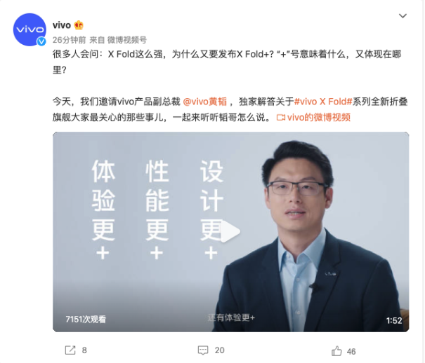 今天,vivo微博发布视频,为即将于9月26日正式发布的新品折叠屏手机X Fold+预热。在这条视频当中,vivo产品副总裁黄韬对一些网友关心的问题进行了解答。黄韬表示,在整个X Fold系列当中,X Fold+是最高配版本。很多用户都是基于对vivo的信任首次尝试折叠屏手机,而X Fold+则是对于用户信任的回报。相对于vivo X Fold,X Fold+的高配主要体现在设计、性能和体验三方面更佳,而至于更多的产品信息,还是等到9月26日的新品发布会才会揭晓。