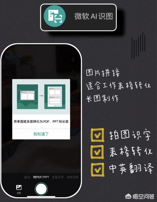 推荐理由:此小程序支持图片拼接,适合工作表格车转化为长图制作;另外支持拍图识字、表格转化、中英翻译等功能。