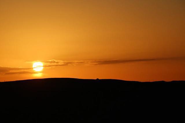 太阳偷偷地爬出了地平线,日出的霞光把沙漠染成了金色。骆驼绝美的身形,如同电影的回放,在我们的相机里,定格成了千年的剪影。天边的余晖缓缓退去,躲入连绵起伏的沙脊线。驼把式摇摆的背影伴随着悠扬的驼铃声渐渐远去,消失在我们的视线里。我们也要赶赴下一站胡杨林了。