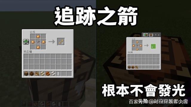 然后我们来说说追迹之箭,在Java版本中,这个箭矢是可以被合成的,但是在基岩版本中,对不起,合成都是一个大问题,其原因是因为在基岩版本中,其实根本就没有发光这么一说,所以也就无法合成了。